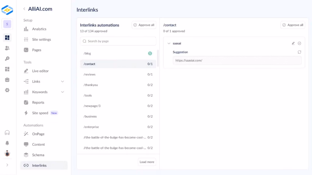 Alli AI’s internal linking feature automatically analyzes your website content and generates intelligent suggestions for internal links between your pages. The system recommends relevant connections, suggests optimized anchor text, and helps implement these links to improve site structure and navigation.