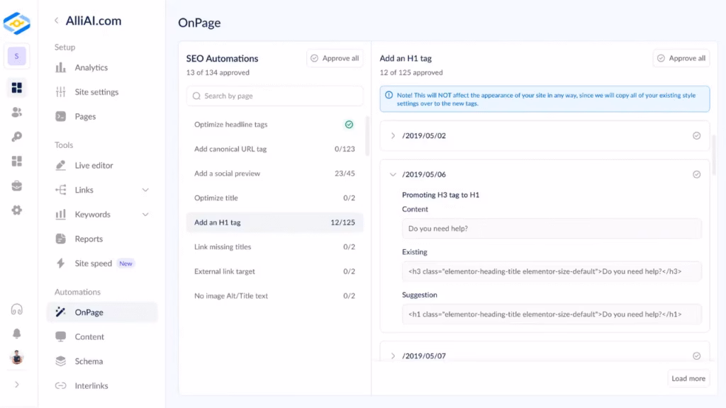 However, there have been complaints about recommendation accuracy, especially for smaller sites. Users report that Alli AI’s SEO suggestions are not always appropriate. Sites need to review all recommendations carefully rather than automatically approve them. The system’s suggestions do not always account for your specific niche, audience size, or content strategy.