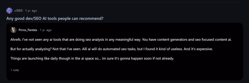Reddit users do not discuss Alli AI frequently since the tool lacks the widespread adoption of other AI SEO tools. The limited mentions that exist focus primarily on pricing concerns and perceived value issues.