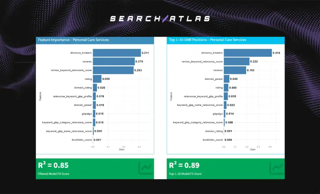 According to the global analysis conducted by Search Atlas, the model explains 92% to 93% of the variance in GBP rankings. The global model refers to the all-sectors dataset, which weights features across industries.
