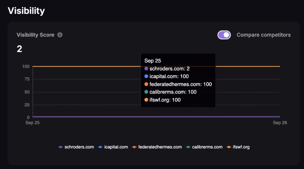 Reviewing these trends highlights the impact of campaigns, partnerships, or product announcements on brand discovery. Consistent growth in visibility score signals expanding authority, while declines indicate areas where competitors are gaining advantage.