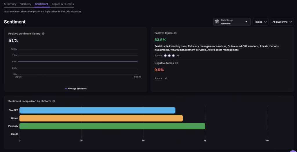 - Reinforcing trust through sentiment monitoring. Clients choose providers they perceive as secure, reliable, and transparent. The Sentiment dashboard shows whether AI assistants frame your institution in positive or negative terms, giving you a way to respond proactively.