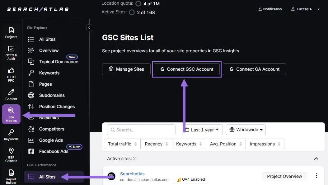Go to Site Metrics > All Sites > Connect GSC Account.