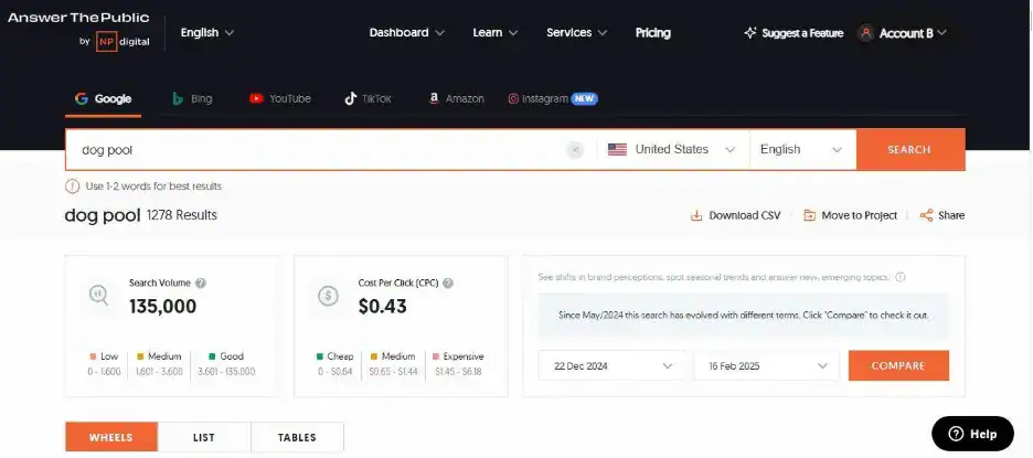 AnswerThePublic transforms autocomplete data from Google, Bing, TikTok, Amazon, and Instagram into question graphs, prepositions, comparisons, and alphabetical keyword lists. It excels at discovering search intent and content ideation through visual formats and search listening alerts.