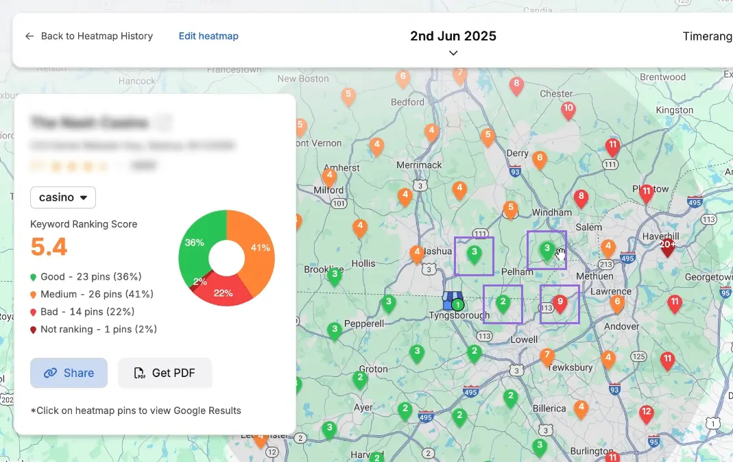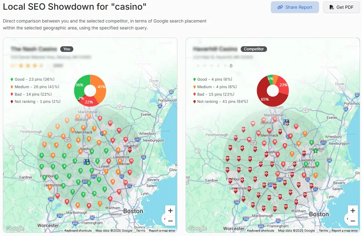 It’s possible to analyze how the business compares its rankings against each competitor in the area. Click on an individual pin you want to target.