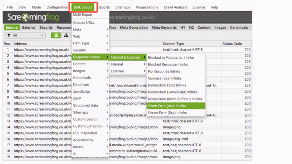 Export from Screaming Frog