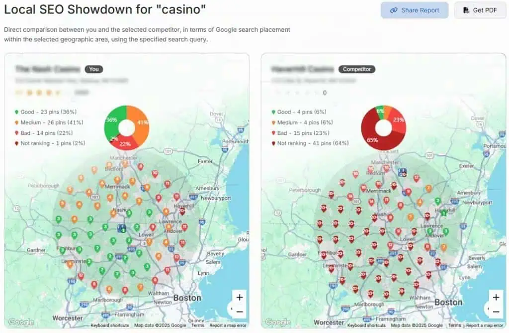 You can see how your business ranks compared to local competitors in your area. Click on any individual pin you want to focus on.
