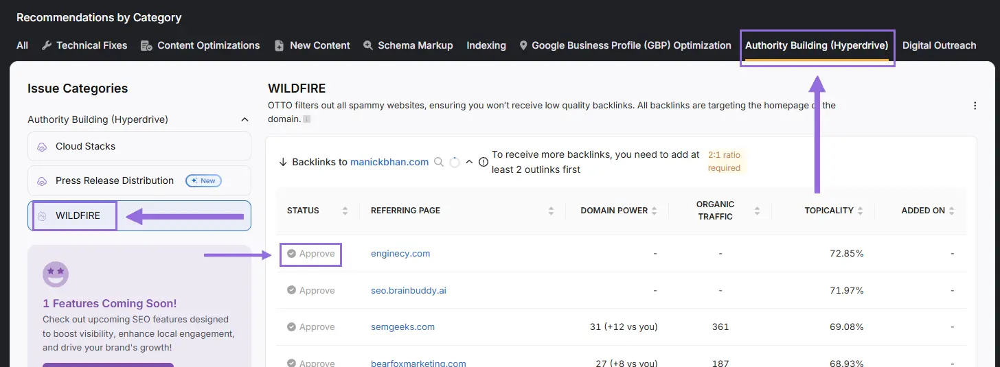 4. Automate High-Quality Backlink Growth with WILDFIRE. WILDFIRE in OTTO matches your law firm with safe, relevant websites in the Search Atlas network using an AI-driven 2:1 exchange model. Add two outbound links to approved, authoritative sites. Receive one inbound link from a vetted, topically aligned domain. All placements are reviewed for domain power and legal relevance, so your profile grows safely and fast without exposure to shady link schemes.