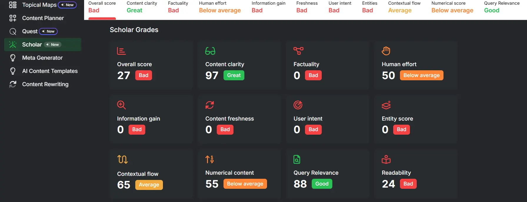 The Search Atlas SCHOLAR tool acts as a content inspector for the legal field. SCHOLAR reviews every draft for semantic structure, factual accuracy, numerical precision, and information gain before you publish. Search Atlas SCHOLAR scores drafts using Google’s own content quality signals, then shows what to add or refine to improve rankings and build trust. You use it to review your articles, landing pages, or case studies and confirm they are ready to outrank competitors.