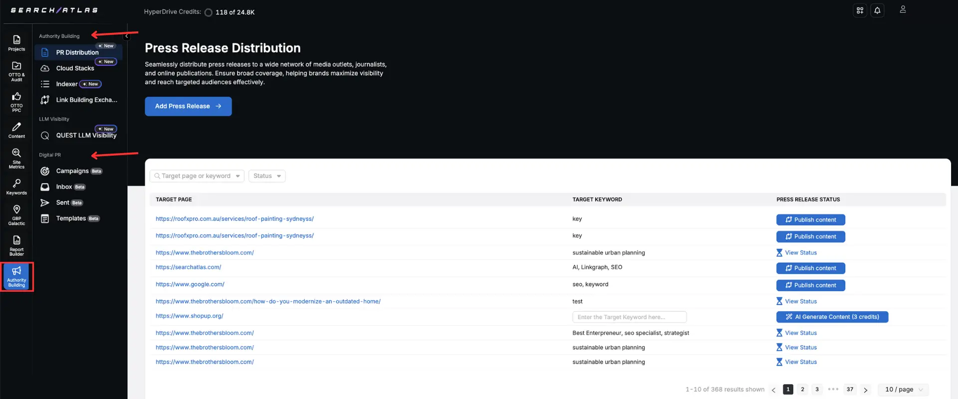 2. Pursue Digital PR and Local News Coverage. Use Search Atlas Digital PR and Outreach tools to pitch legal expertise, community stories, or client wins to journalists and industry blogs. High-authority media links and features drive both trust and traffic, especially for practice areas like criminal defense, personal injury, or business law, where client research is extensive.