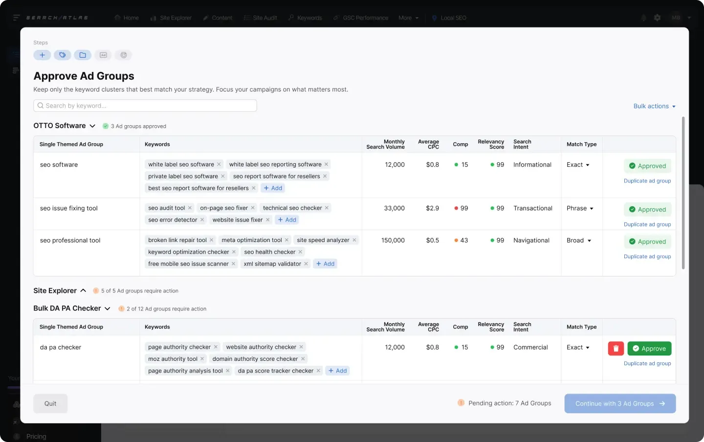 Search Atlas Content Planner organizes keywords into topic clusters built from a single seed term. It expands one query, such as “B2B SaaS pricing,” into hundreds of related clusters that outline a full content funnel.