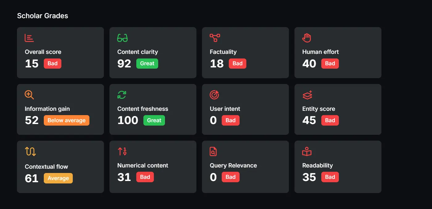 Search Atlas SCHOLAR inspects every draft before publication. It applies Google-aligned scoring models to confirm semantic structure, factual clarity, and contextual depth so every page meets standards for trust and visibility.