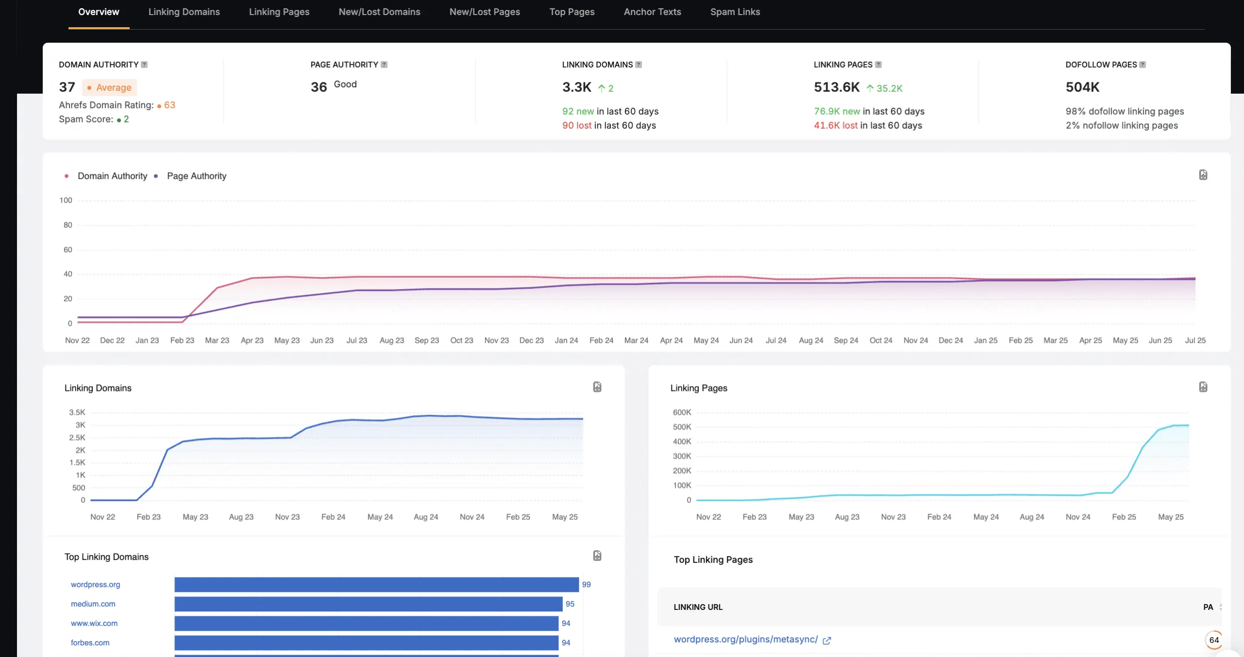 Search Atlas Site Explorer tracks ranking signals, backlink quality, and traffic visibility. It integrates Domain Power (DP) to evaluate real authority based on keyword share and traffic performance.
