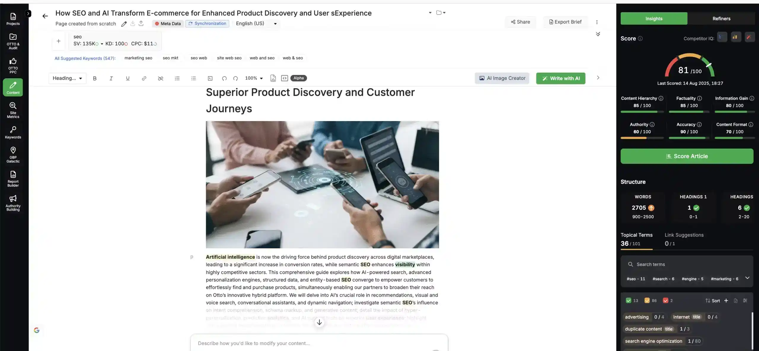 Content Genius automates readability with over 15 microagents for clarity, structure, and depth. It scores passages for entity coverage, tone, and information gain, while suggesting internal links, schema, and contextual images.