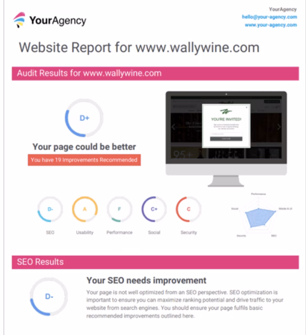 To use SEOptimer White Label Reports, upload branding assets, configure check visibility, and select language options. SEOptimer generates a polished, shareable report tailored to your agency’s identity and communication style.